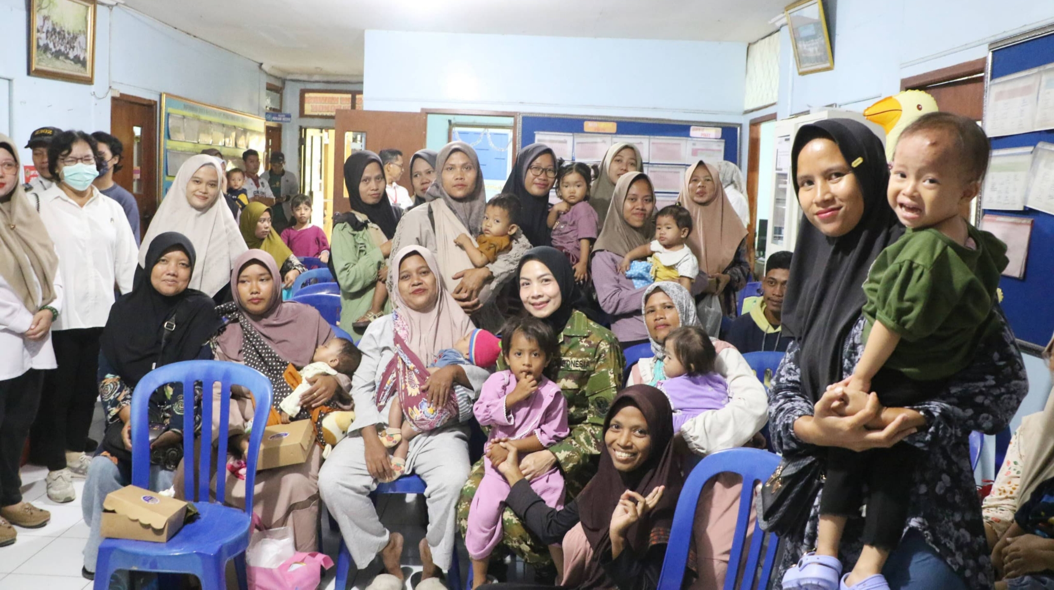 Bupati juga sempat menggendong seorang balita. Sang balita terlihat anteng di pangkuan Bupati. “Wah lucunya ya,” kata Bupati.